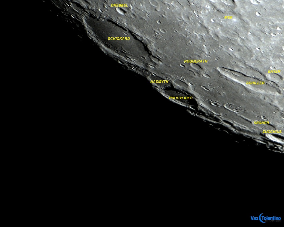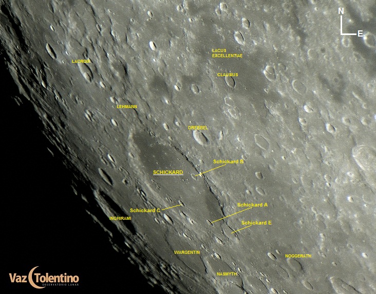Schickard é uma enorme cratera de impacto, com 227 Km de diâmetro, localizada perto do limbo sudoeste da Lua. Por causa dessa localização, apesar de ser circular, parece ter formato de elipse a partir de nosso ponto de vista.