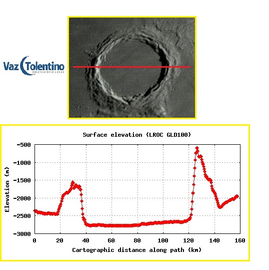 Isto posto, analisaremos com a ferramenta “Path” o desenho do perfil cratera ARCHIMEDES, com suas cotas, a partir de um corte de uma linha imaginária, na direção Oeste-Leste.