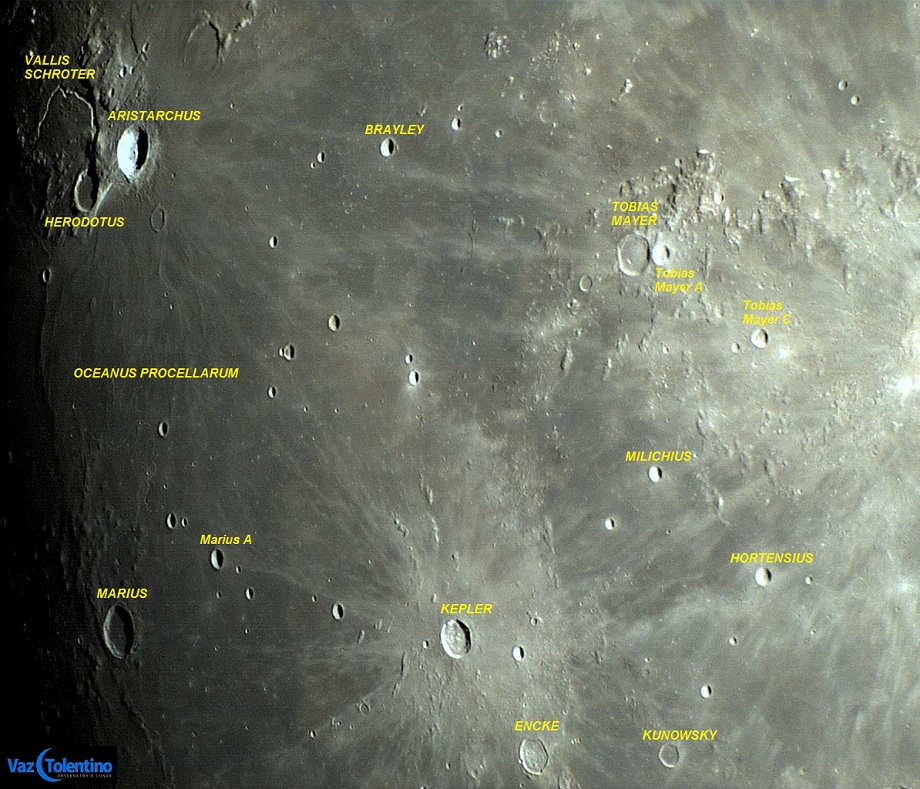 Não há como não perceber a bela e proeminente cratera de impacto Kepler, que é uma formação circular bem definida, com cerca de 32 Km de diâmetro e 2,6 Km de profundidade.
