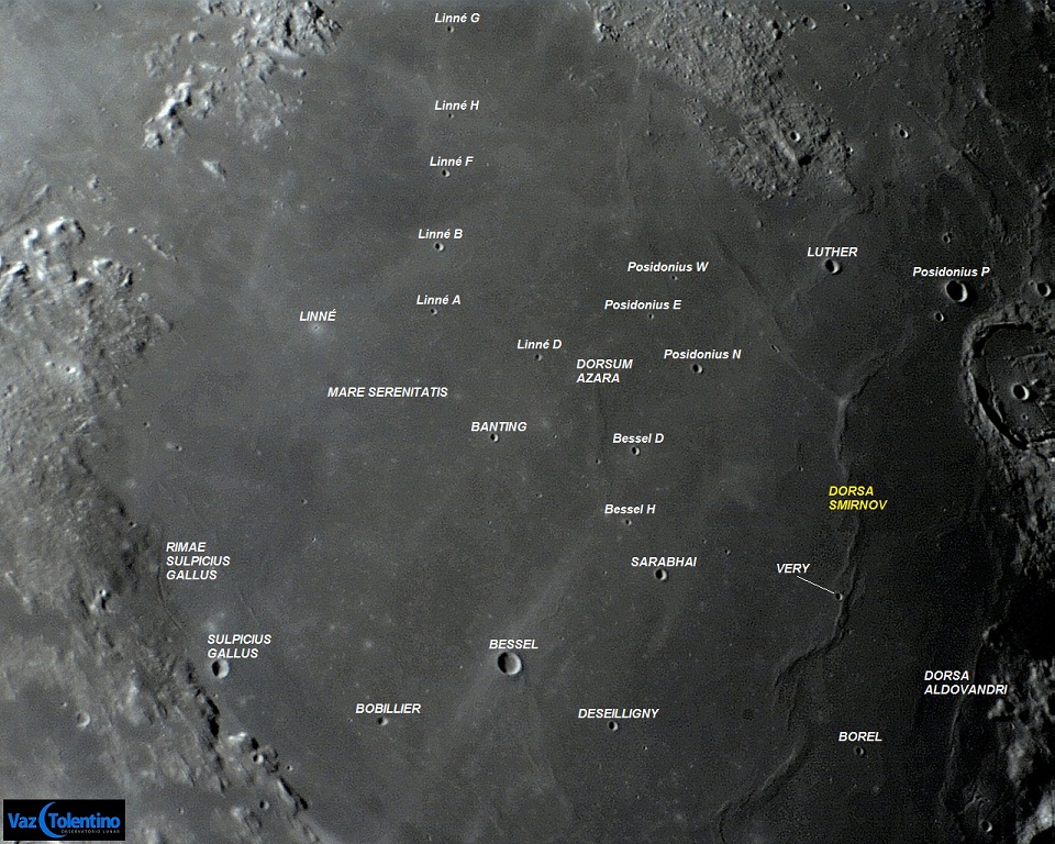 Paralelo à margem leste do Mare SERENITATIS, orientado no sentido Norte - Sul, existe um destacado sistema de estrias rugosas, sinuosas e contínuas, constituídas por cristas protuberantes de lava basáltica endurecida. Esse sistema de estrias existente por sobre a superfície plana do Mare SERENITATIS é conhecido como DORSA SMIRNOV (coordenadas selenográficas: LAT: 25o N, LON: 25o E).