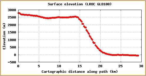 Com o uso do LROC ACT-REACT QuickMap, interceptamos Rupes ALTAI no ponto médio de seu comprimento, com um "corte" de sudoeste para nordeste, onde encontramos um perfil em forma de degrau, com 2,5 Km de elevação.