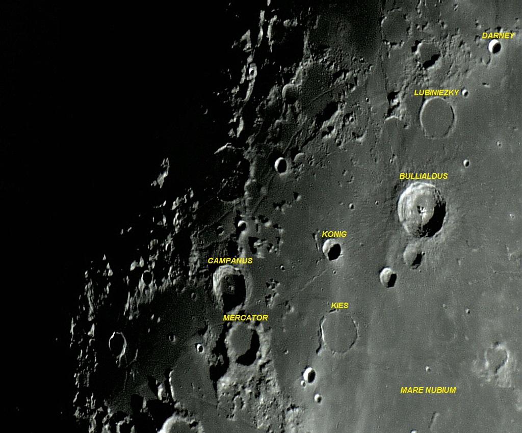 Perto do período da Lua Cheia, o complexo da montanhoso central da cratera Bullialdus torna-se muito claro e destacado e, a superfície do piso interno, apresenta muitos pontos brilhantes.