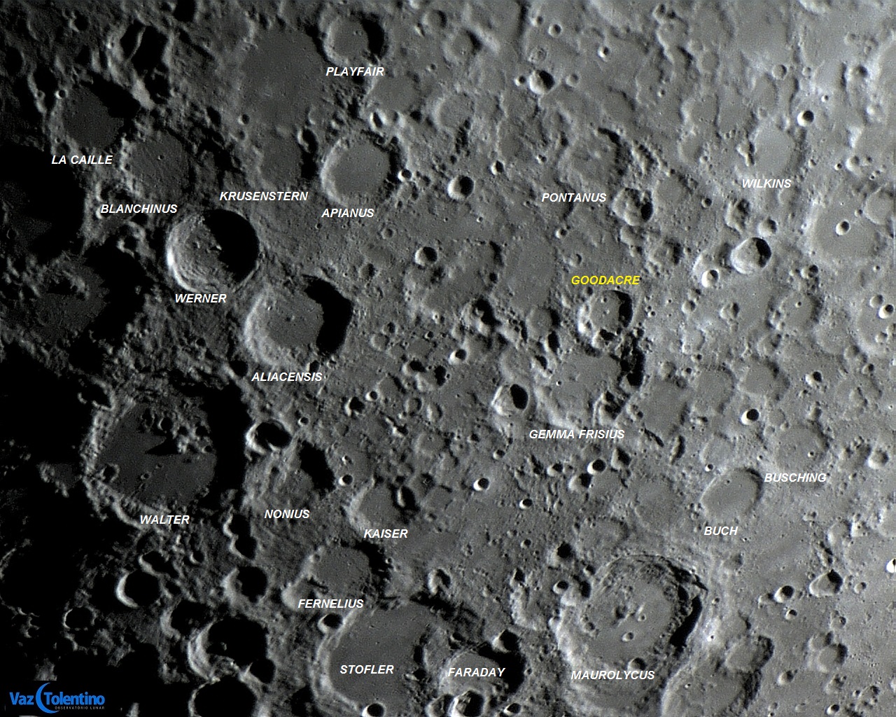 Foto: A cratera GOODACRE (diâmetro: 46 Km, profundidade: 3,2 Km, LAT: 32° 42′ 00″ S, 14° 06′ 00″ E) localizada nas terras altas cravejadas de crateras do quadrante sudeste lunar. Essa cratera homenageia o selenógrafo WalterGoodacre (1856 – 1938).