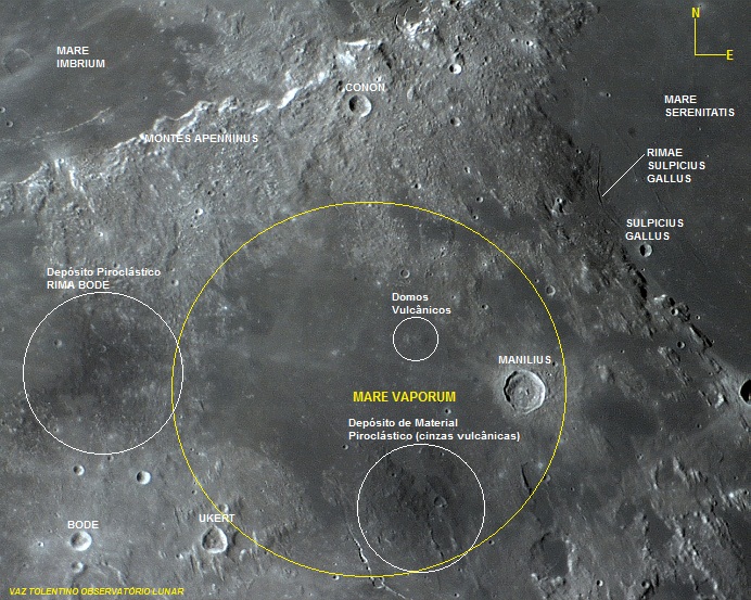 As lavas do Mare VAPORUM preenchem uma região circular baixa, dando indício de que talvez ali tivesse sido uma grande cratera de impacto no passado lunar.