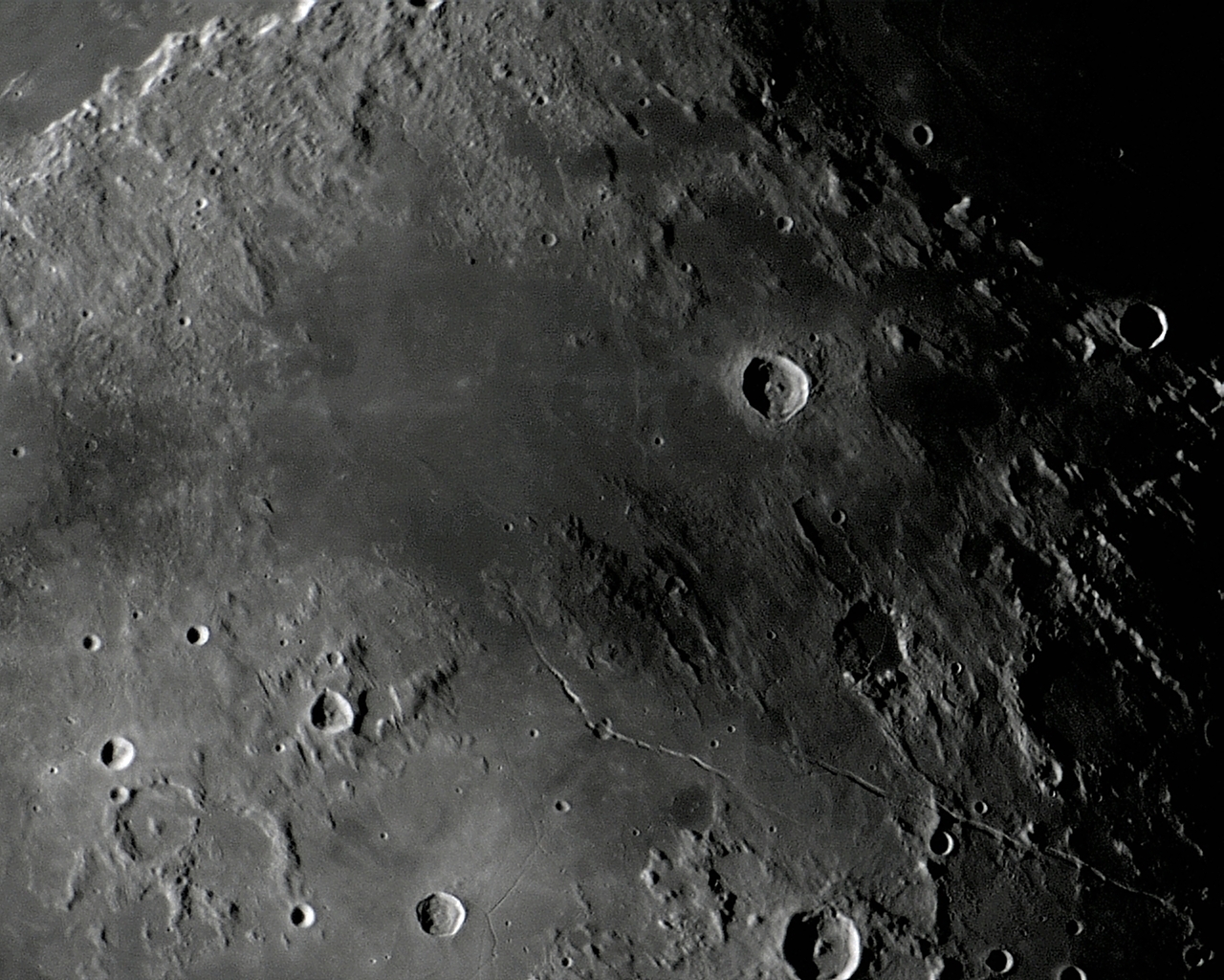 As lavas do Mare VAPORUM margeiam as encostas traseiras dos Montes APENNINUS, que foram compostos por material ejetado pelo enorme impacto que criou a grande bacia do Mare IMBRIUM.