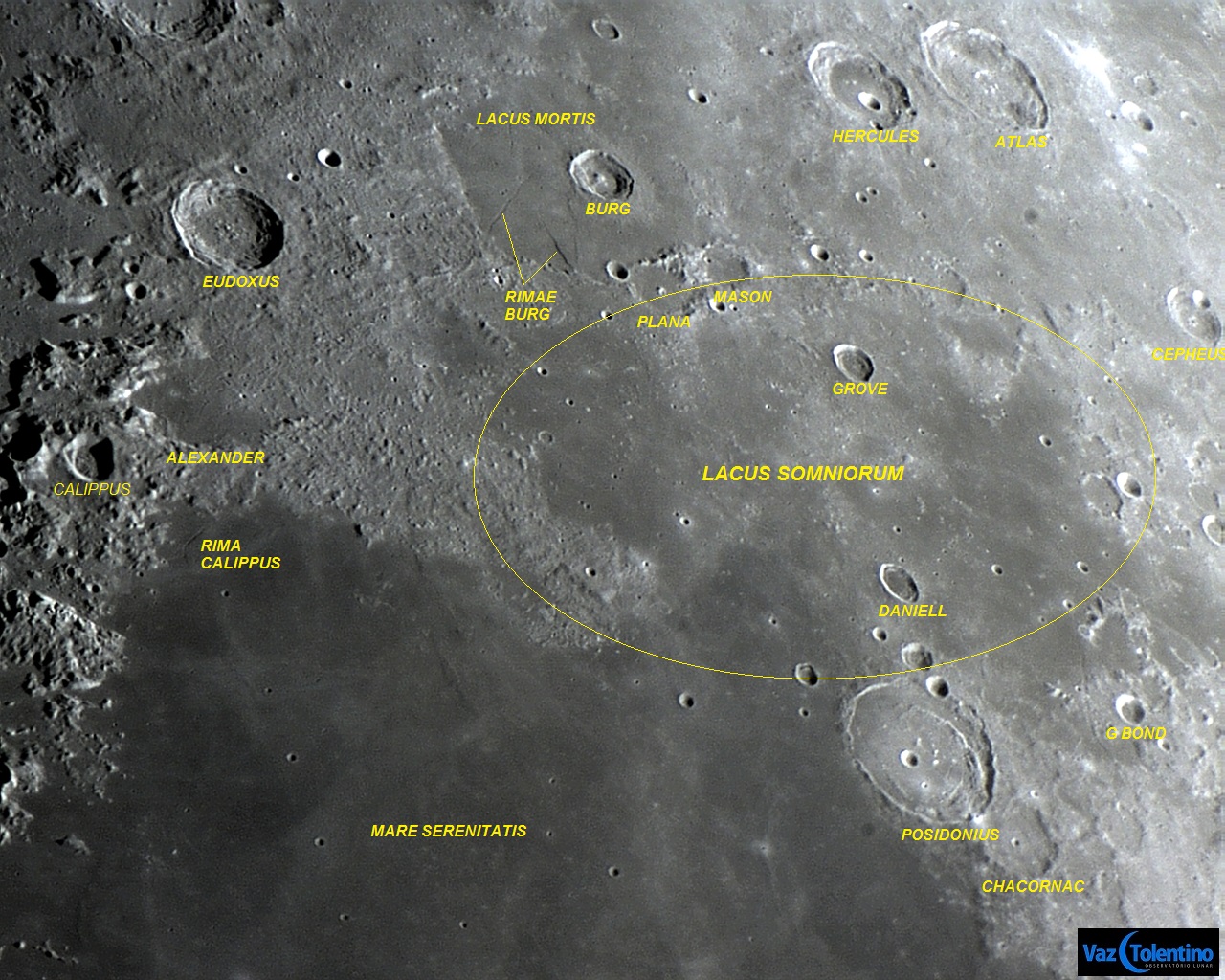 Lacus SOMNIORUM (lago dos sonhos) é uma formação relativamente plana de contorno irregular e de bordas mal definidas, com ampla superfície de lava basáltica escura (baixo albedo) que hospeda algumas minúsculas crateras de impacto e ocupa cerca de 70.000m2.