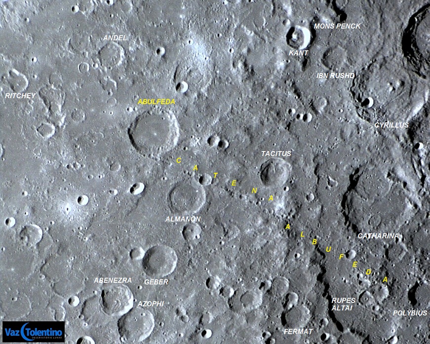 CATENA ABULFEDA é um alinhamento ou cadeia de crateras com quase 210 km de extensão, composta por uma sequência de impactos de diâmetros variados, na direção Noroeste-Sudeste, partindo da borda sul de ALBUFEDA, passando pela borda norte de ALMANON , atravessando a parte norte da RUPES ALTAI e finalizando em POLYBIUS.