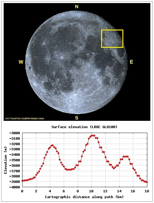 Foto: A cratera GEMINUS e seu perfil altimétrico. Foto executada por Ricardo José Vaz Tolentino em 10 de março de 2012, 01:07:12.