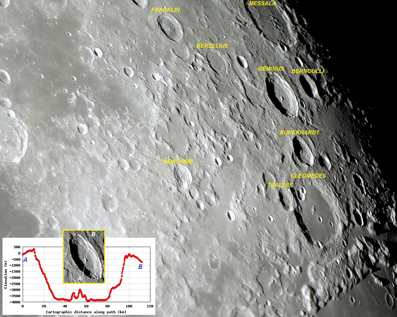 GEMINUS é circundada por destacadas crateras, como MESSALA (diâmetro: 128 Km), BERNOULLI (Diâmetro: 49 Km), BURCKHARDT (Diâmetro: 60 Km) e CLEOMEDES (Diâmetro: 129 Km).
