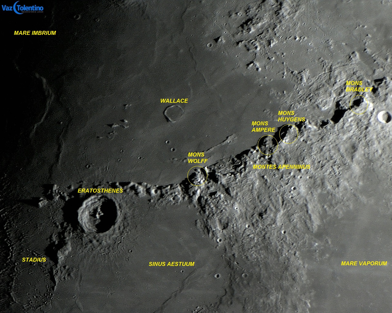 O destacado conjunto de montanhas dos Montes APENNINUS localiza-se na orla sudeste do Mare IMBRIUM. A cordilheira imprime uma leve curva, iniciando próximo da cratera ERATOSTHENES e seguindo na direção nordeste. Montes APENINNUS contém a mais alta montanha da face visível da Lua, o Mons HUYGENS, com seus 5,5 km de altitude.