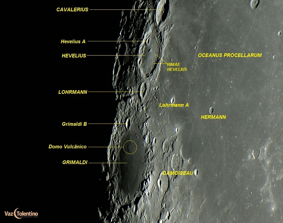 Foto abaixo: A memória do selenógrafo Wilhelm Gotthelf LOHRMANN (1796 – 1840) foi registrada na Lua, através da cratera LOHRMANN (diâmetro: 31 Km, profundidade: 1,7 Km; LAT: 00° 30′ 00″ S e LON: 67° 12′ 00″ W), posicionada entre as crateras GRIMALDI e HEVELIUS, junto ao limbo lunar oeste.