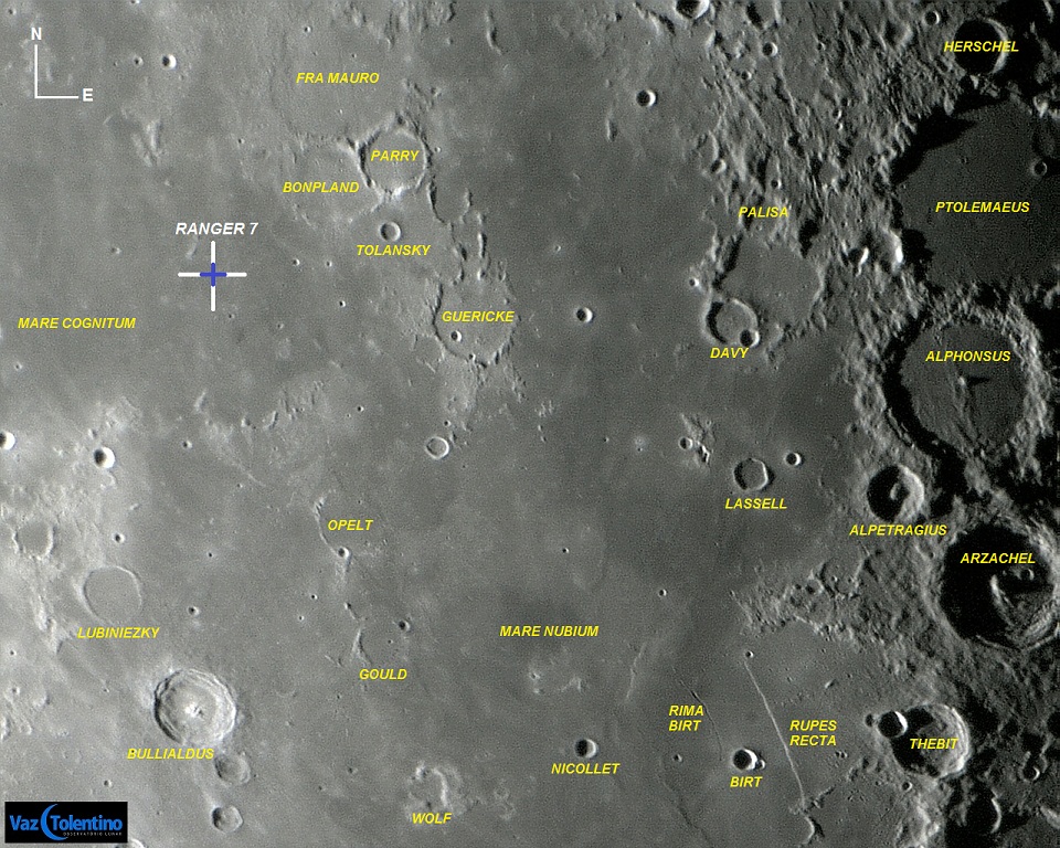 Para executar as imagens, a sonda lunar Ranger 7 carregava 6 câmeras Vidicon, sendo 2 câmeras grande angular e 4 câmeras de ângulo estreito de alta defonição. As câmeras foram dispostas em dois blocos separados, com transmissores e fontes de alimentação também separados, para obter maior probabilidade e confiabilidade na captura de imagens. A sonda possuia 2 painés solares que geravam 200 W e uma antena de alto ganho para transmissão dos dados e imagens. O impacto da sonda lunar Ranger 7 aconteceu 16 Km além do ponto planejado, numa velocidade de 2,62 Km/s, na área interna do MARE COGNITUM, nas coordenadas selenográficas: LAT: 10° 21′ 0″ S, LON: 20° 34′ 48″ W.