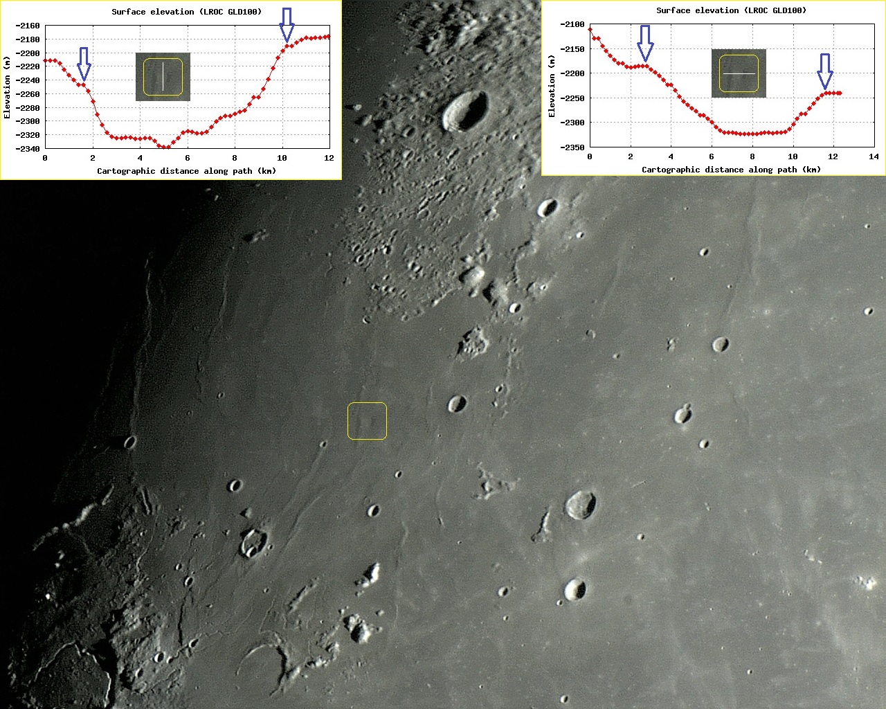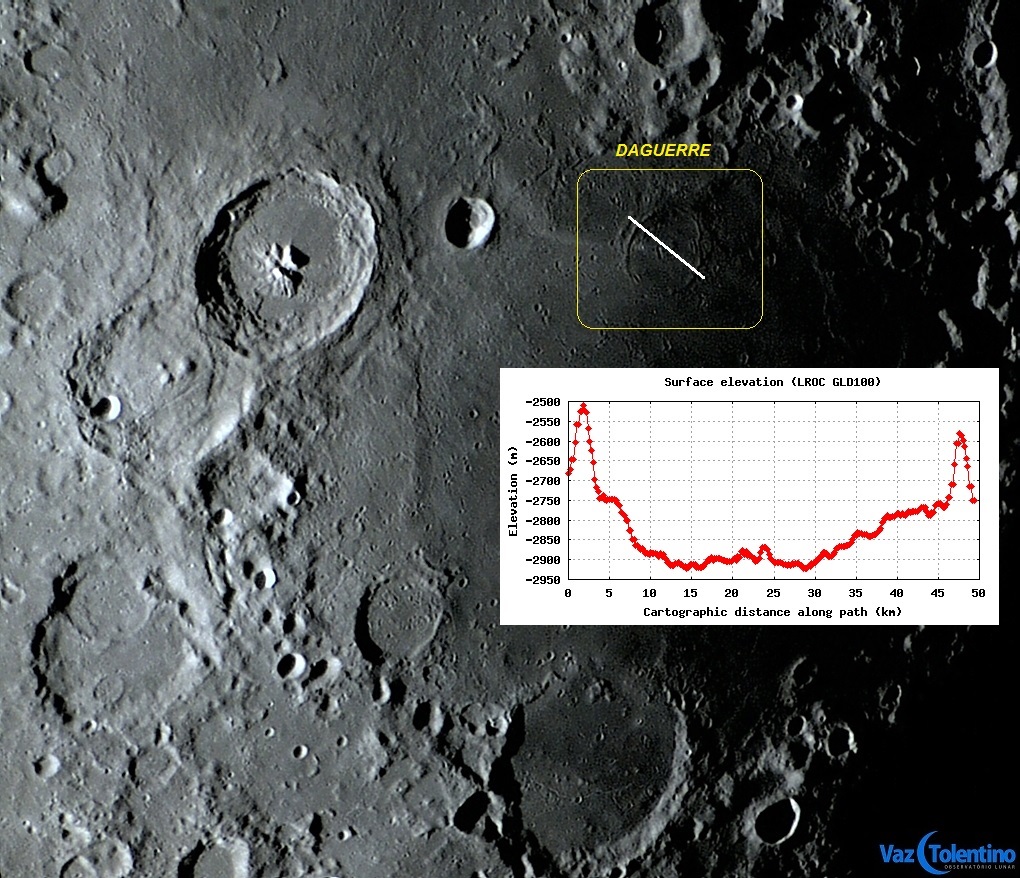Foto: A cratera fantasma DAGUERRE, catalogada pela IAU, com seu perfil altimétrico. Foto executada com apenas 1 frame pelo VTOL.