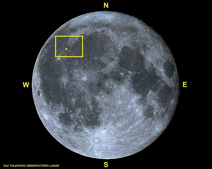 Na fotografia executada pelo selenógrafo Prof. Vaz Tolentino do VTOL em 21 de maio de 2013, às 22:45:18 hora local, o ângulo oblíquo da luz solar denunciou uma incomum formação lunar, caracterizando uma pequena e rasa depressão circular, com sombra em arco na parede interna do lado leste. Essa suposta cratera fantasma de morfologia simples, localiza-se na região de mar de lavas, entre o Oceanus Procellarum e o Mare Imbrium. A suposta pequena cratera fóssil mostra-se totalmente suplantada por lava basáltica. Porém, a delimitação de seu pequeno contorno circular e a curvatura de sua rasa depressão concava são evidentes. Após pesquisas na literatura técnica nada foi encontrado a respeito dessa cratera fóssil de pequeno porte. Isso indica que a misteriosa formação não possui catalogação na IAU (International Astronomical Union).