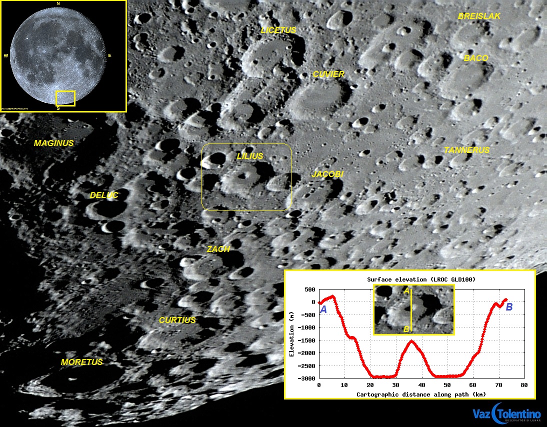LILIUS é uma cratera de impacto de morfologia complexa, localizada nas terras altas no sul da Lua, uma região rugosa e cravejada de impactos de todos os tamanhos.