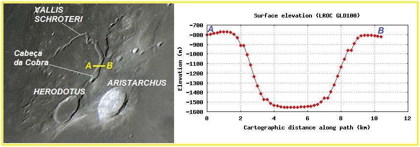 Vallis SCHRÖTERI(LAT: 26.2o N LON: 50.8o W) é o maior canal sinuoso da Lua, parecendo o leito seco de um grande rio, com largura de aproximadamente 11 Km na região de sua origem, conhecida como “cabeça da cobra” (de onde fluiu a lava e iniciou o canal) e, a partir daí, diminui e assume uma largura média em torno dos 5,5 Km. A profundidade média desse grande canal fica em torno de 600 m e o comprimento total atinge cerca de 185 Km. Existe um canal bem mais fino e raso que atravessa ao longo do interior de Vallis SCHÖTERI, com o comprimento cerca de 40 Km maior do que o dele.