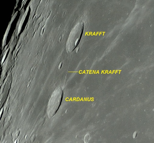 Essas duas interessantes crateras estão unidas por uma cadeia de crateras secundárias, que parte da borda nordeste de CARDANUS, atinge KRAFFT e continua através de seu piso. Essa incomum sequência de minúsculas crateras sobrepostas, de orientação no sentido norte - sul, tem aproximadamente 70 Km de comprimento e é conhecida como Catena Krafft (LAT: 15.0° N, LON: 72.0° W).