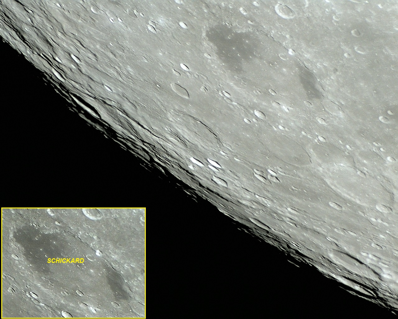 Schickard é uma enorme cratera de impacto, com 227 Km de diâmetro, localizada perto do limbo sudoeste da Lua. Por causa dessa localização, apesar de ser circular, parece ter formato de elipse a partir de nosso ponto de vista.