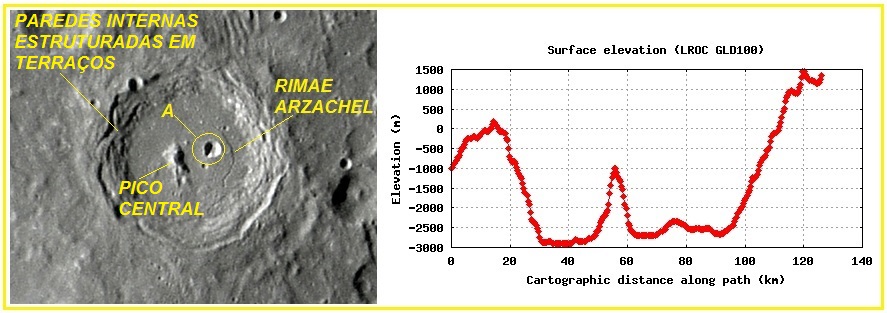 Ilustração: A interessante cratera ARZACHEL com suas paredes estruturadas em terraços, pico central e o destacado canal que pertence ao sistema Rimae ARZACHEL. O perfil altimétrico W – E de ARZACHEL também é apresentado.