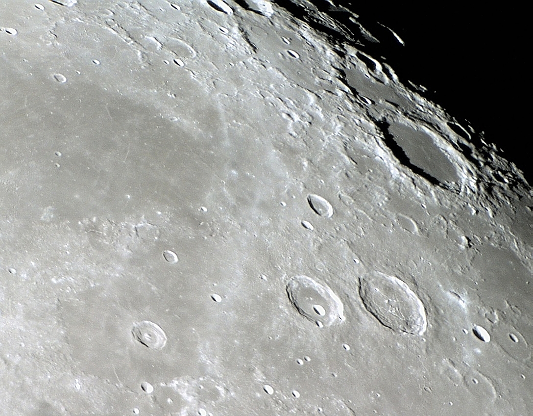 Foto: A grande cratera de piso escuro e liso ENDYMION próxima do limbo nordeste lunar. Apesar de seu formato verdadeiro ser circular, apresenta-se oval perante nosso ponto de vista a partir da Terra. Nessa composição apresenta-se também, o perfil altimétrico N – S de ENDYMION. Foto executada com apenas 1 frame em 10 de março de 2012, 00:56:12 (03:56:12 UT).