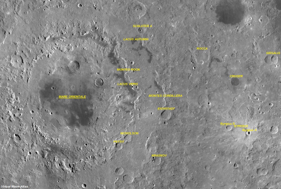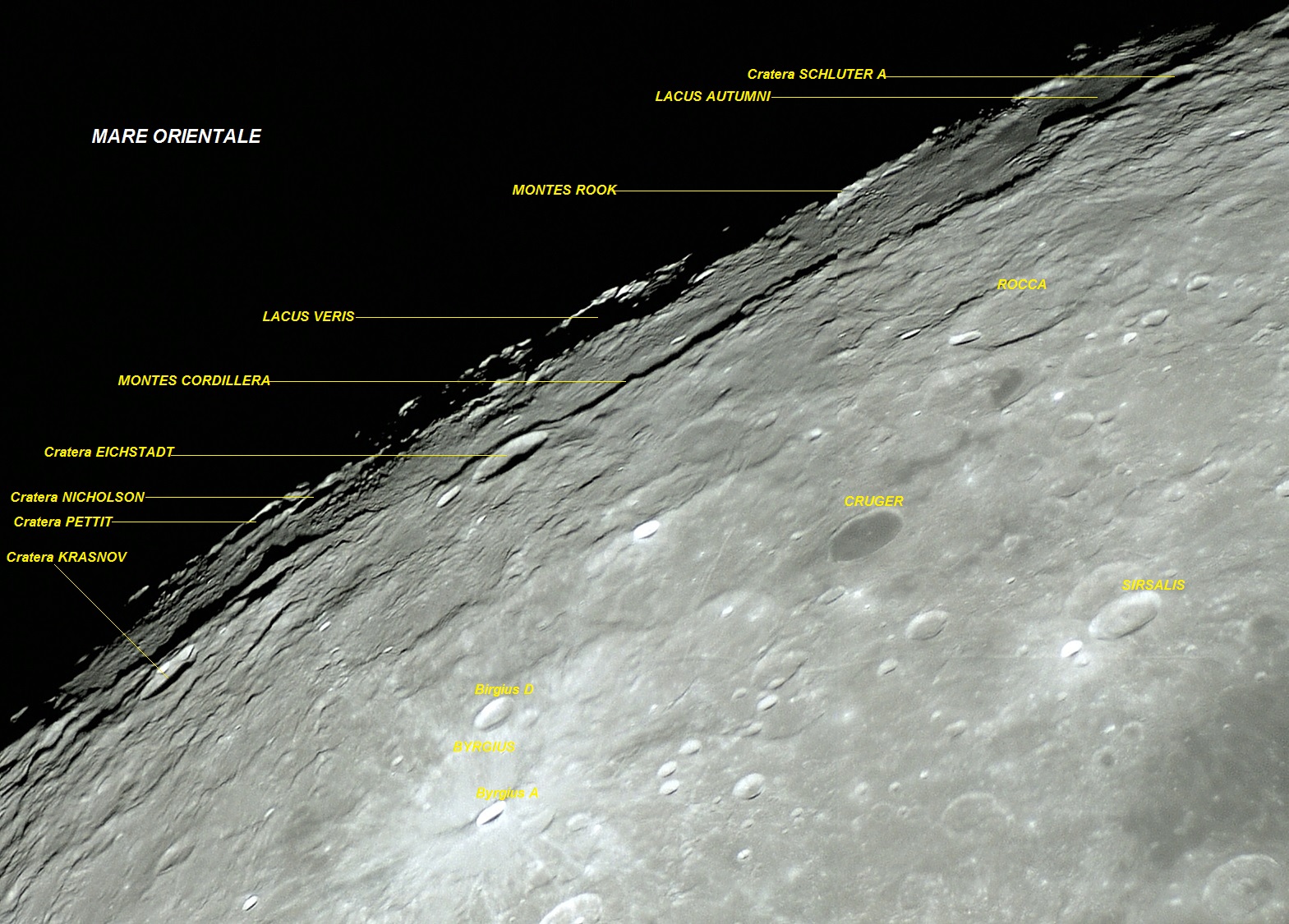 Mare ORIENTALE apresenta aproximadamente 300 Km de diâmetro. O anel interno de cadeia de montanhas, conhecido como Montes ROOK, atinge altitude máxima de 6 Km em relação à superfície circundante e cerca de 600 Km de perímetro. No interior de Montes ROOK localiza-se um lago de lavas escuras, conhecido como Lacus VERIS. Essa região, sob a luz do Sol, destaca suas lavas escuras e cria contrastes com o brilho dos picos das montanhas, fazendo com que as formações locais tornem-se bastante apreciáveis e ajudem no senso de orientação dessa grande região.