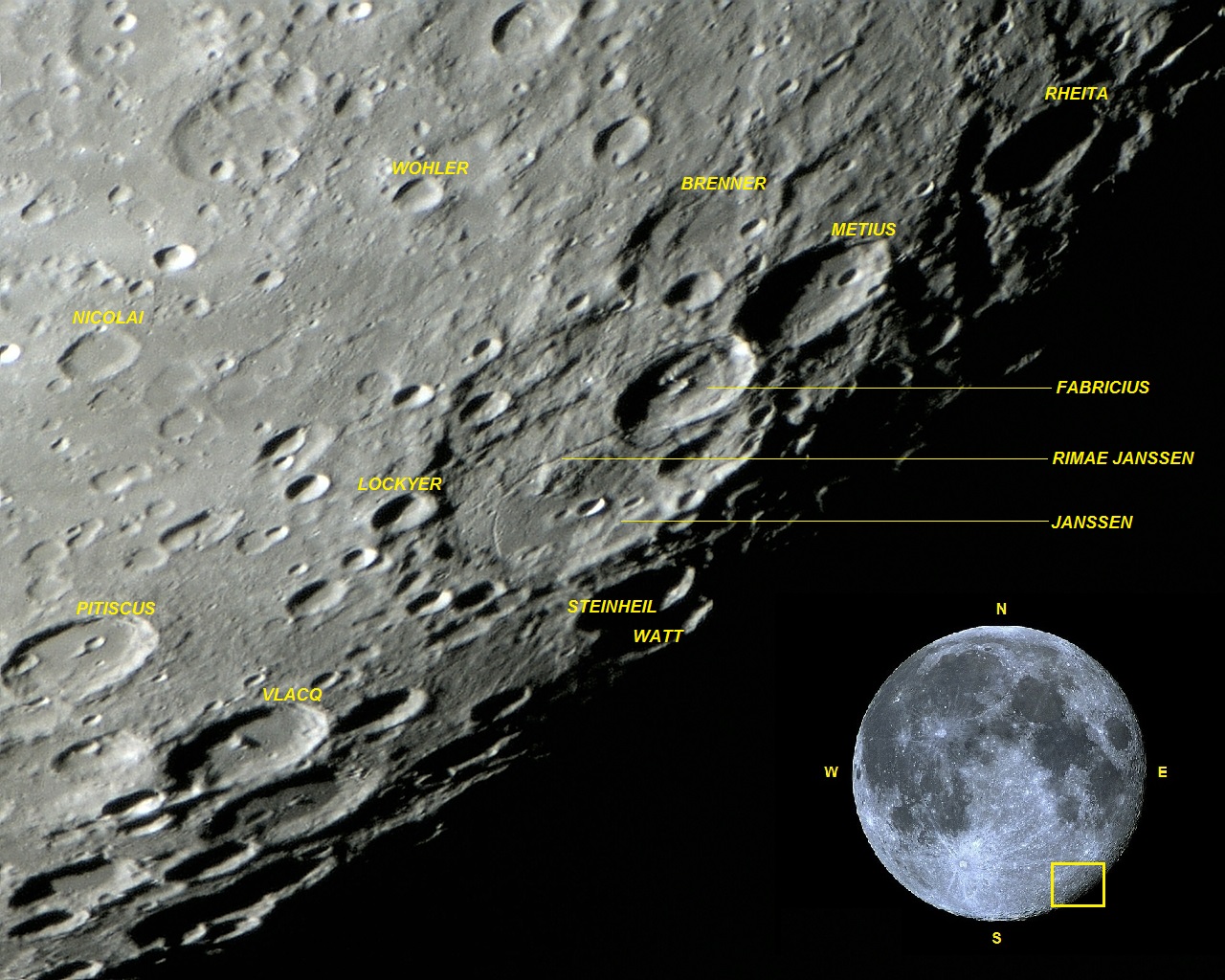 Mais abaixo, cerca de 100 Km do lado sudoeste de Janssen encontra-se a proeminente cratera de impacto Vlacq (diâmetro: 89Km; profundidade: 3,8 Km; LAT: 53.3º S e LON: 38.8º E). É uma cratera de formação circular com paredes altas, estruturadas internamente em forma de degraus ou curvas de nível (terraces). Seu piso interno é plano (inundado por lava), apresentando montanha central com 2 picos, originada pela reação do piso ao impacto que a criou.