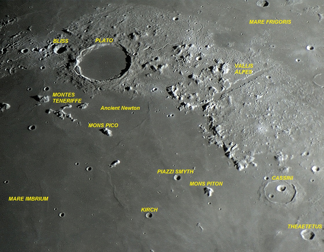 PLATO é uma das mais famosas, proeminentes e observadas crateras de impacto da Lua. Esta bela formação está localizada na margem norte do Mare IMBRIUM e sua região é considerada uma das mais lindas e fotografadas da superfície lunar.