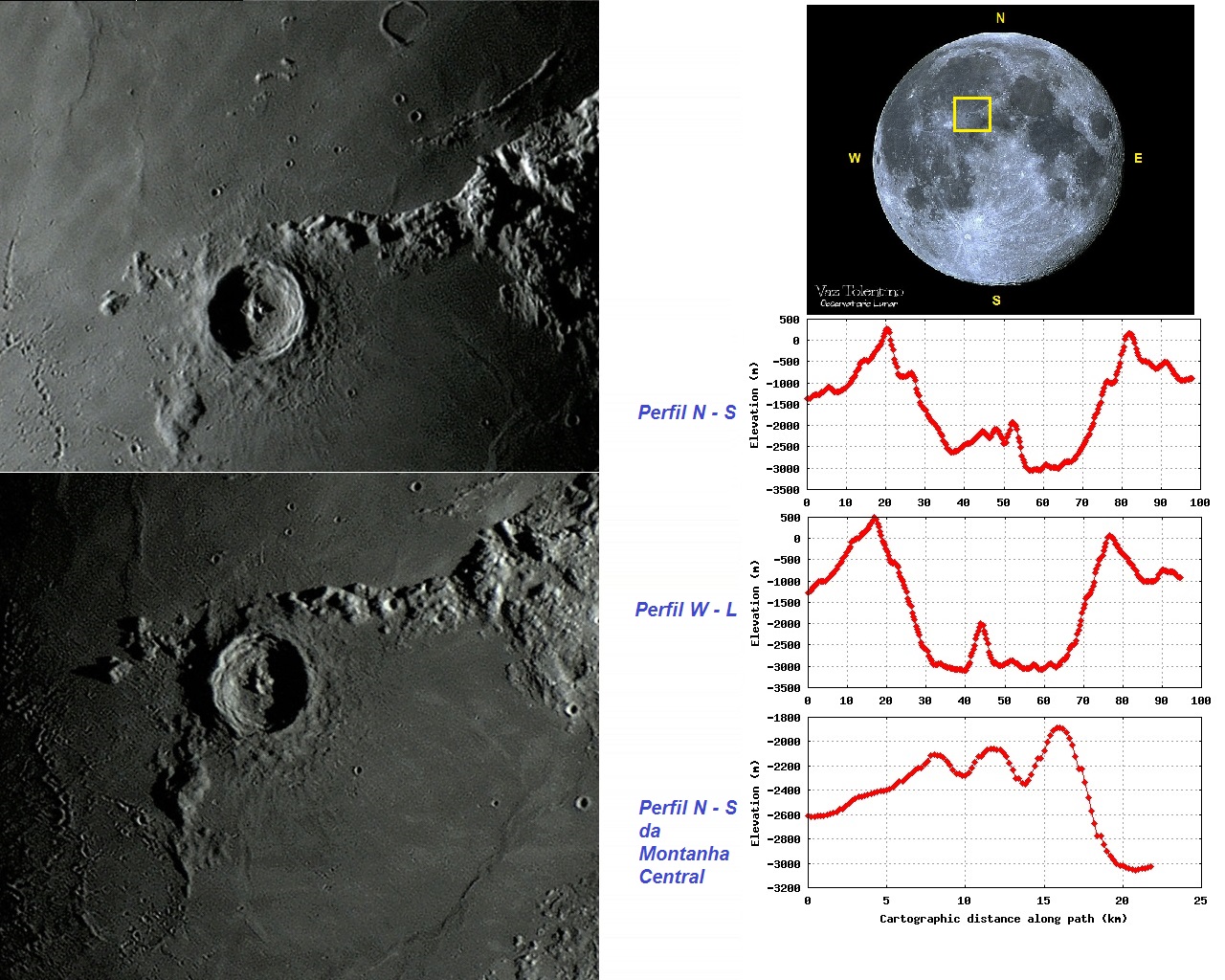 Foto: Composição fotográfica mostrando a proeminente cratera ERATOSTHENES em dois tempos. Na imagem superior ERATOSTHENES recebe a luz solar vinda do oeste (tarde lunar) e na imagem inferior, vinda do leste (manhã lunar). O posicionamento das fotos na Lua cheia também é mostrado juntamente com os perfis altimétricos da bela cratera. Fotos por VTOL em 27 de março de 2011, 05:21:12 (superior) e 20 de junho de 2010, 20:17:42 (inferior).