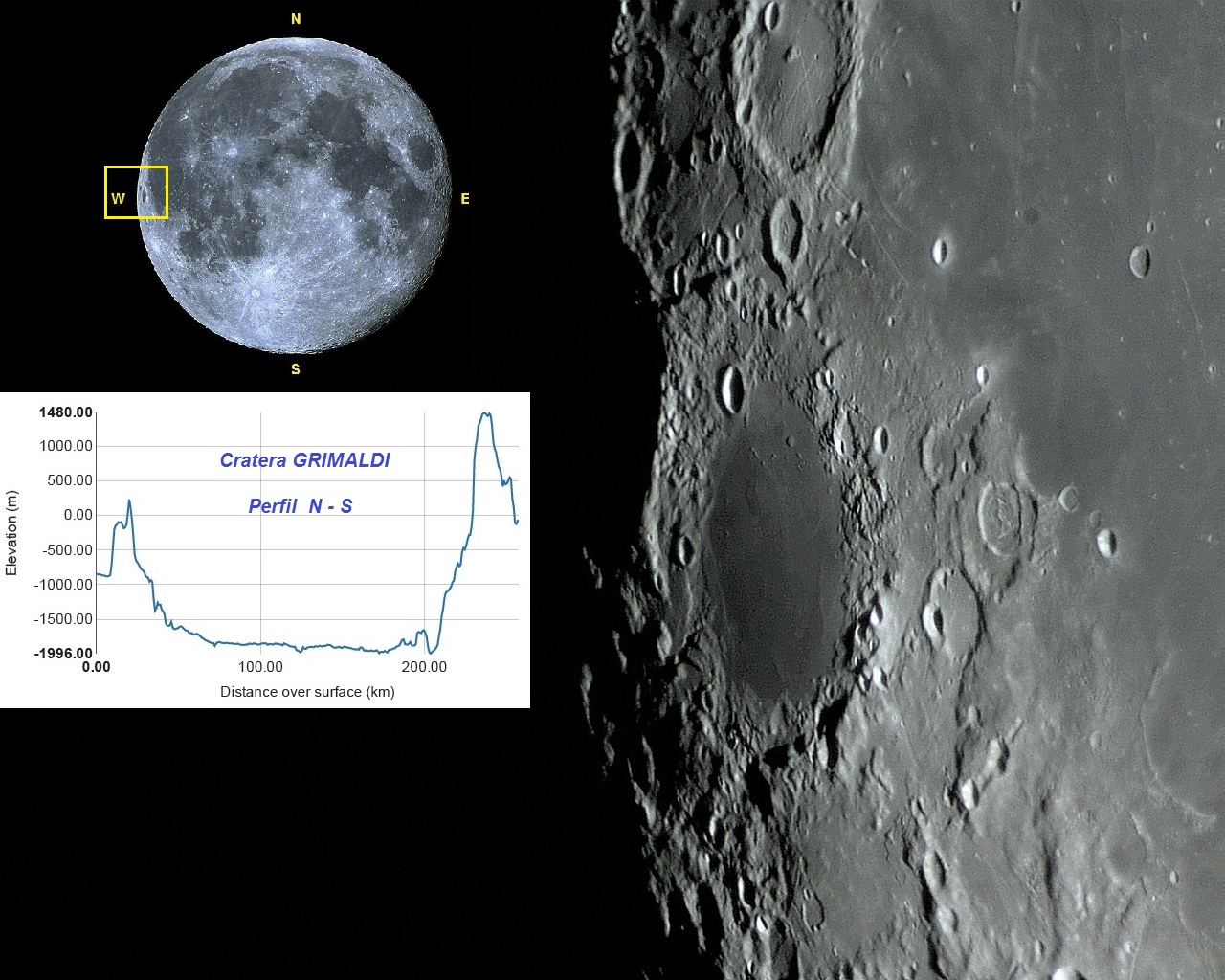 As regiões dos limbos da Lua oferecem um desafio para o observador, porque todos os detalhes são distorcidos por encurtamento. A grande, escura e destacada cratera GRIMALDI localiza-se próxima do limbo lunar oeste. Por causa disso, sua forma real que é circular, apresenta-se como elíptica a partir do nosso ponto de vista da Terra.