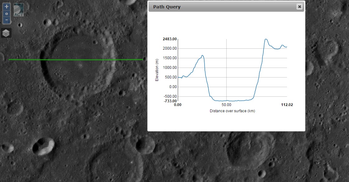 Imagem: A cratera ABULFEDA e seu perfil altimétrico W - E. - LRO QuickMap.