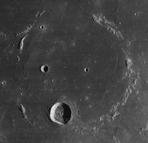 Imagem: A grande cratera fantasma Flamsteed P e a isolada e destacada cratera FLAMSTEED - Sonda Lunar LRO / NASA.