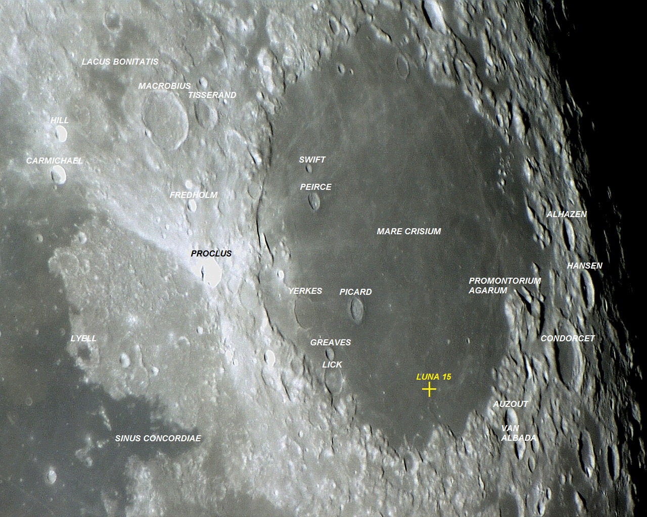 Lançada à bordo do foguete soviético Proton-K/D  partir do cosmódromo de Baikonour, apenas três dias antes da missão Apollo 11, a sonda Luna 15 foi a terceira tentativa soviética de coletar amostras na superfície lunar e retornar com os espécimes para a Terra. Porém, por causa de uma pane do sistema direcional, a nave russa chocou-se com a superfície lunar em 17 de julho de 1969, às 15:50 UT. O impacto aconteceu no Mare CRISIUM nas coordenadas LAT: 17°00′00″ N, LON: 60°00′00″ E.