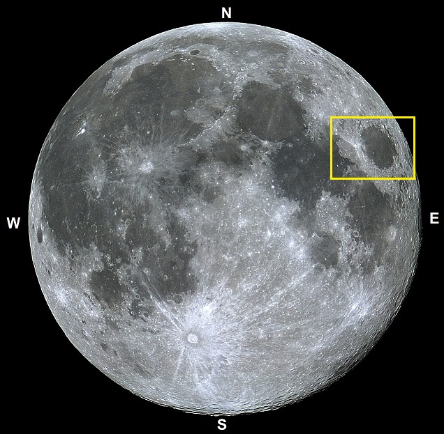 Imagem: Lua cheia mostrando a abrangência da foto enfocando o local de impacto da sonda lunar soviética Luna 15 - VTOL.