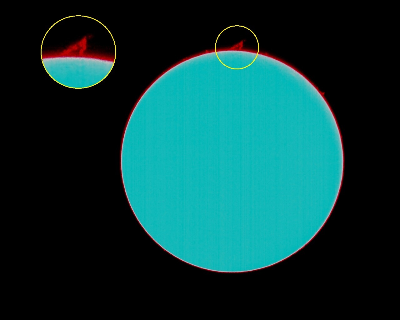 Também, em paralelo às visões das duas manchas citadas, uma bela proeminência com milhares de quilômetros de extensão, surgiu no limbo solar. Veja foto abaixo.