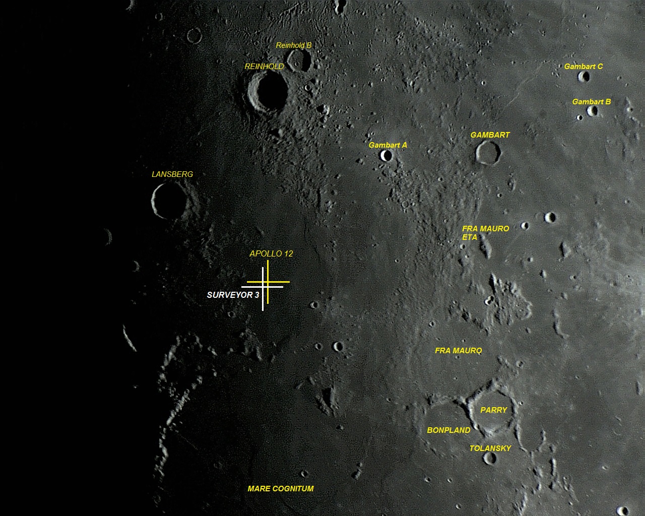 A missão Apollo 12 (14 a 24 de novembro de 1969) executou o segundo pouso tripulado na superfície lunar, em 19 de novembro de 1969, às 06:54:35 UT, numa região do Oceanus PROCELLARUM, ao norte do Mare COGNITUM (LAT: 03° 11' 51" S, LON: 23° 23' 08" W). Sua tripulação era composta pelos astronautas Alan Bean, Charles Conrad e Richard Gordon.