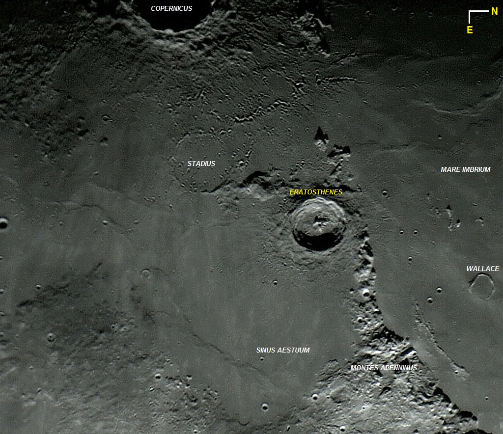 A cratera de impacto de morfologia complexa ERATOSTHENES está situada no estremo sul da cordilheira dos Montes APENNINUS, bem na fronteira entre o Mare IMBRIUM e o Sinus AESTUUM. Possui aro circular bem definido, com encostas altas e íngremes. Suas paredes internas são esculpidas em terraços (como se fossem grandes degraus).  Os degraus foram formados quando as faces de dentro das paredes entraram em colapso e deslizaram por toda a circunferência interna. A borda externa apresenta encostas fortificadas no seu entorno, criada por materiais escavados e ejetados durante o impacto.