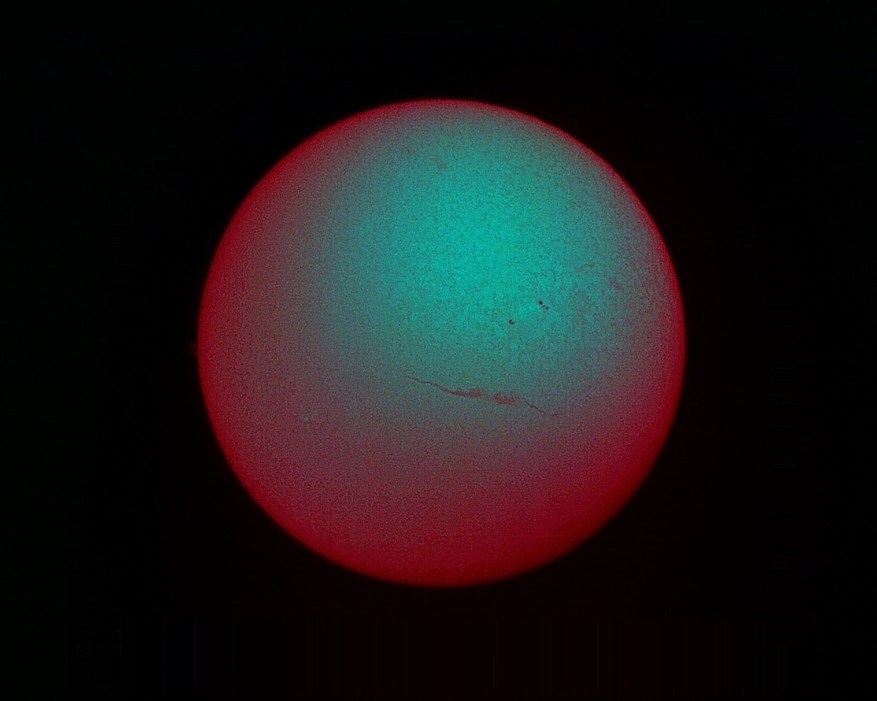 Imagem: As proeminências são estruturas brilhantes quando vistas sobre o limbo solar, mas parecem escuros quando vistas contra o disco solar brilhante, por causa da temperatura mais baixa do plasma. Nesse caso, são conhecidas como filamentos. A foto apresenta um grande filamento que aparece próximo do centro do disco solar. Foto obtida com apenas 1 frame em 04/09/2016, 11:52:18 (14:52:18 UT).