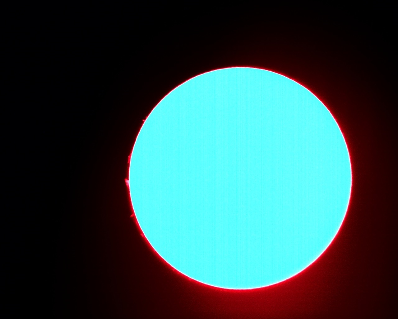 Imagem: Proeminências aparecem no hemisfério oeste do Sol. Proeminências são grandes estruturas brilhantes, originadas na fotosfera do Sol, que podem se estender por até centenas de milhares de quilômetros além da coroa ou corona solar (camada mais externa da atmosfera solar). As proeminências contêm plasma mais frio, suportado por campos magnéticos (campos de força gerados por correntes eléctricas). Foto obtida com apenas 1 frame em 04/09/2016, 11:53:45 (14:53:45 UT).