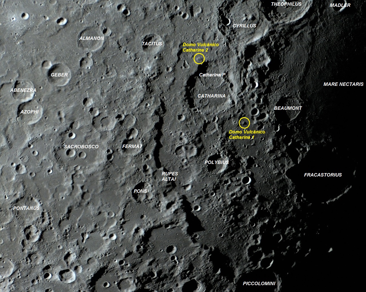 Foto: Os domo vulcânicos de terras altas "Cathatina 1" e "Catharina 2" - LROC / NASA.