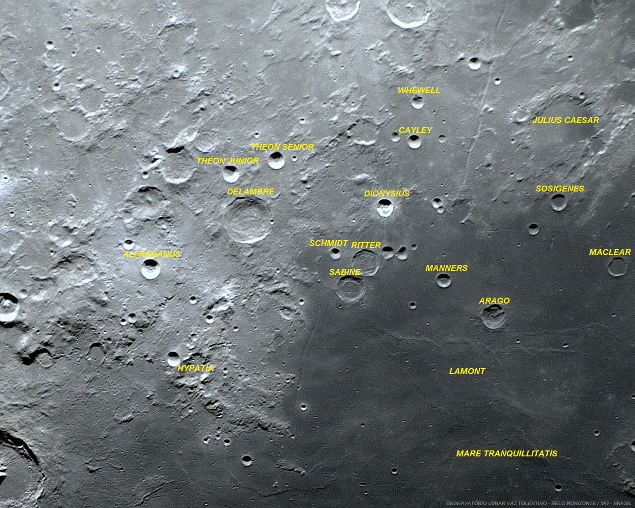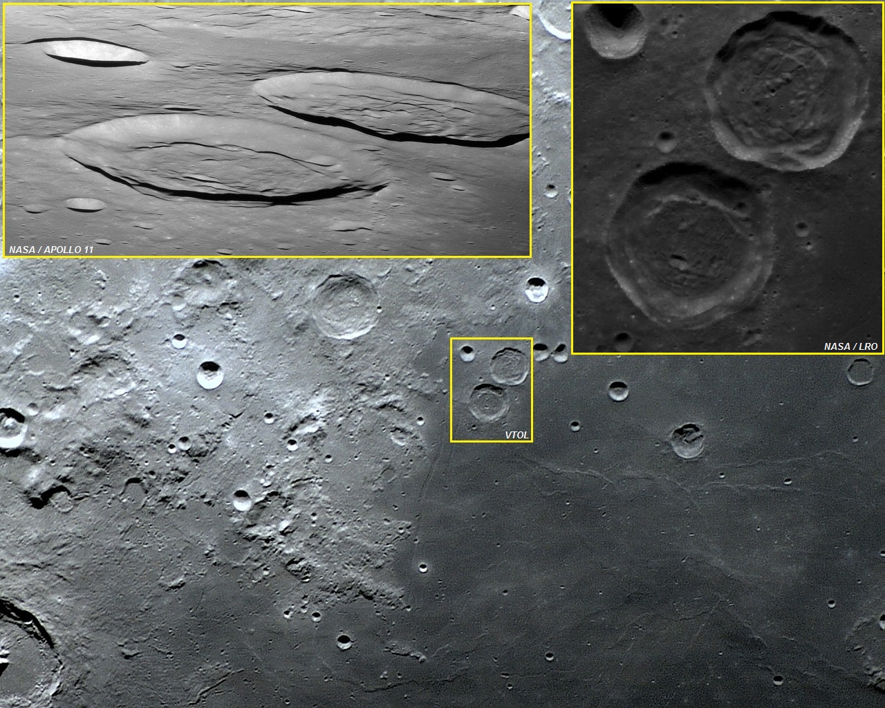 Composição fotográfia: Por sobre a foto com apenas 1 frame executada por VTOL, estão os quadros com fotos orbitais das crateras RITTER e SABINE, feitas pela missão APOLLO 11 e pela sonda lunar robótica LRO da NASA.
