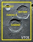 SABINE forma um interessante par e se assemelha muito, com a cratera RITTER, que está localizada quase borda a borda (separadas por apenas 3 Km entre o topo dos aros) no lado noroeste. Junto à borda oeste de SABINE está localizada a pequena cratera Sabine A (diâmetro: 4 Km). A cerca de 85 Km a leste-sudeste esta a “Tranquility Base” (Base do Mar da Tranquilidade), onde foi o local de alunissagem da missão APOLLO 11 e os primeiros humanos caminharam na Lua.