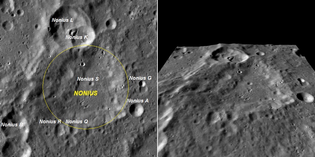 Composição: A cratera NONIUS fotografada em voo orbital pela sonda lunar robótica americana Lunar Reconnaissance Orbiter (LRO) - NASA.