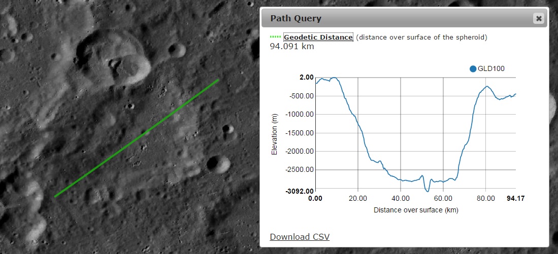 Imagem: O Perfil Altimétrico SW - NE da cratera NONIUS - NASA / LRO QuickMap.