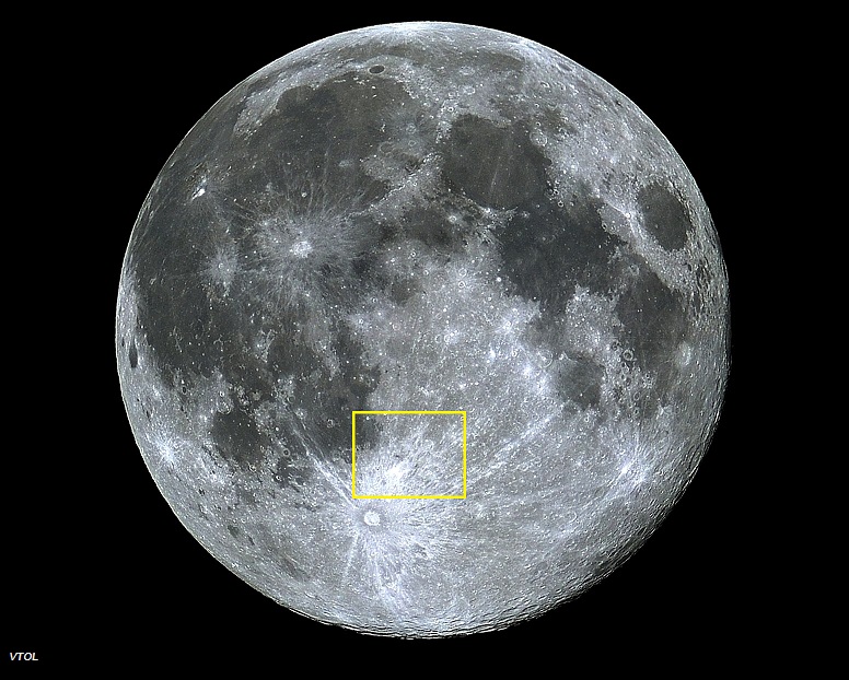 Imagem: Lua cheia apresentando a abrangência da selenofotografia enfocando a cratera NONIUS - VTOL.