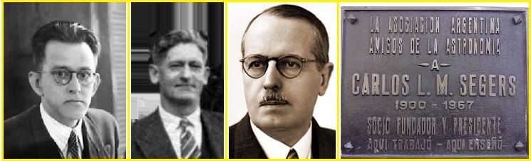 Composição: As fotos do astrônomo argentino Jorge Emilio Bobone (1901 – 1958), do astrônomo argentino Bernhard Hildebrandt Dawson (1890 – 1960)., do fisiologista argentino Bernardo Alberto Houssay (1887 - 1971) e a placa em homenagem ao astrônomo argentino Carlos Segers (1900-1967).