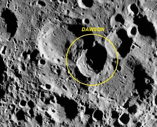 B – Cratera DAWSON – diâmetro: 45 Km, coordenadas selenográficas: LAT: 67° 24′ 00″ S, lon: 134° 42′ 00″ W.