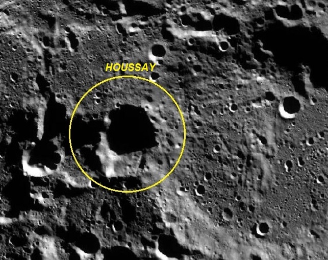 C – Cratera HOUSSAY – diâmetro: 24,5 Km, coordenadas selenográficas: LAT: 83° 00′ 00″ N, LON: 098° 30′ 00″ E.