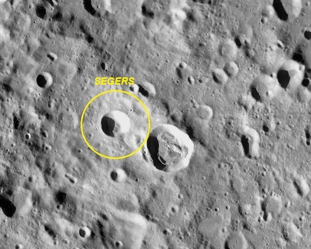 D – Cratera SEGERS – diâmetro: 17 Km, coordenadas selenográficas: LAT: 47° 06′ 00″ N, LON: 127° 42′ 00″ E.