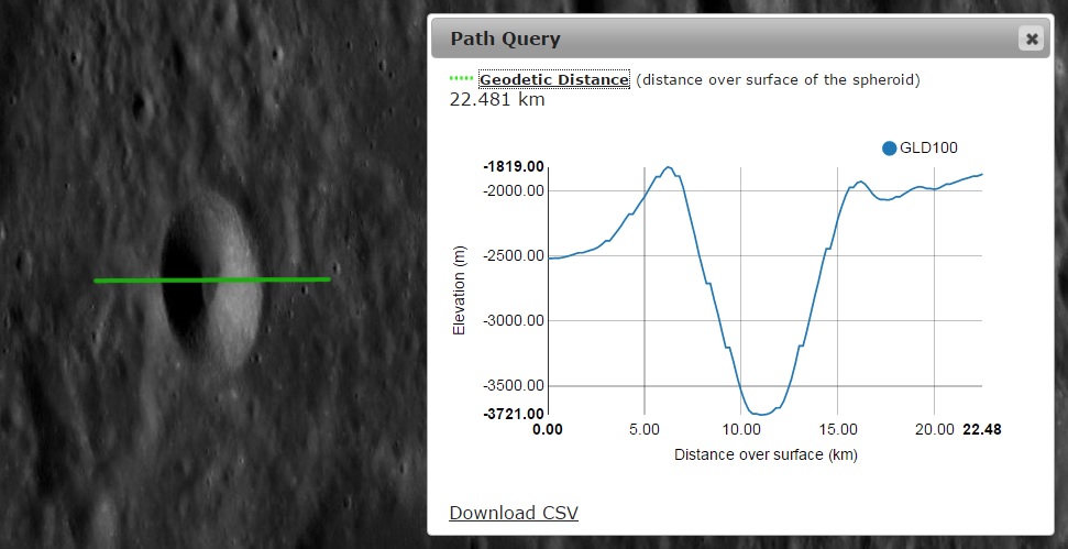 Imagem: O perfil altimétrico W - E da cratera AMEGHINO - NASA / LRO QuickMap.
