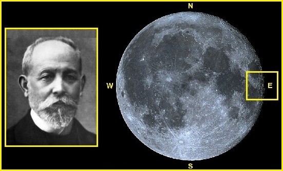 Composição: A foto de Florentino Ameghino e a Lua cheia apresentando a abrangência da foto enfocando a pequena cratera AMEGHINO.